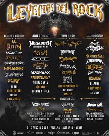 Continuamos con nuestro verano festivalero y desde hoy estaremos en Villena (Alicante) para disfrutar de uno de los festivales decanos del heavy metal patrio, el Leyendas del Rock. Cuatro días de conciertos cuya distribución por días y horarios es la siguiente: