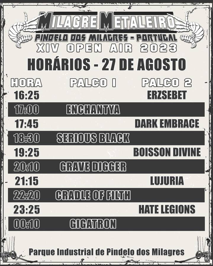 Ya falta menos para la celebración del festival Milagre Metaleiro, que tendrá lugar del 25 al 27 de agosto en Pindelo dos Milagres (Portugal), en su nueva ubicación en Parque Industrial Pindelo Dos Milagres (coordenadas GPS 40,815918 ; -7,945732). El festival cuenta con camping gratuito y el abono para las tres jornadas cuesta 40€ y 23€ las entradas de día, a la venta en masqueticket.com/entrada/1051-milagre-metaleiro-xiv-festival-open-air-2023