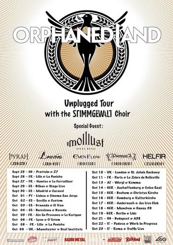 No falta nada para que llegue a nuestro país la gira europea de Orphaned Land en versión acústica con el coro Stimmgewalt. Además de Molllust como invitados nivel europeo, tal como os habíamos informado hace unos días, las fechas españolas estarán compartidas también con el conjunto catalán Leaves (fechas en España y la del 1 de octubre en Lisboa).