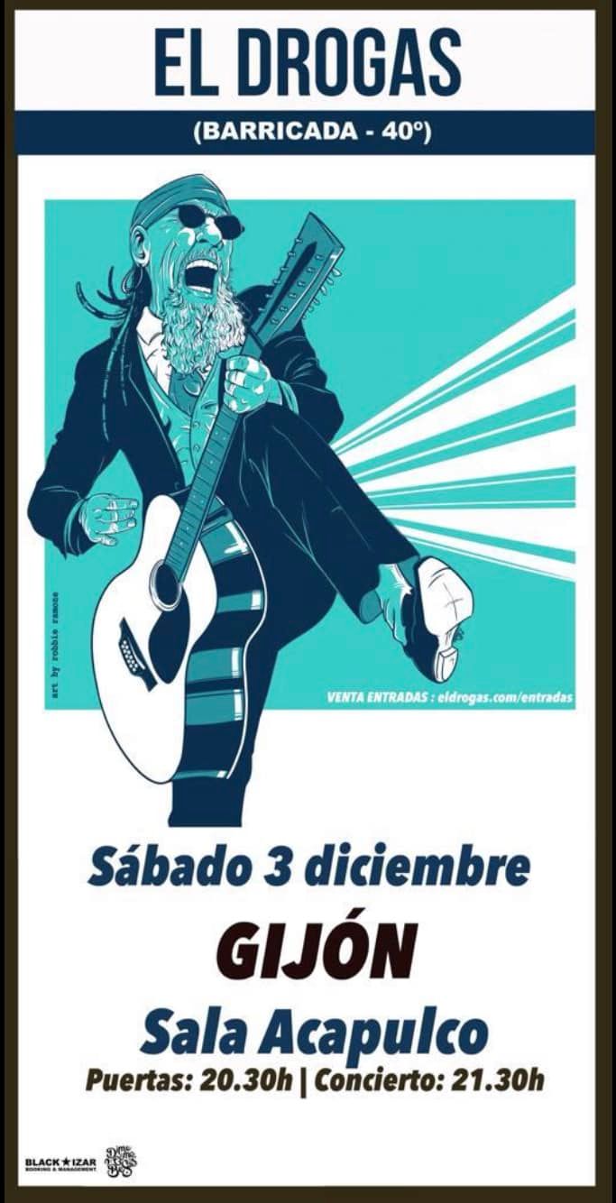 El Drogas anuncia quince nuevas fechas en su gira 40° aniversario de Barricada con parada en Asturias incluida, la cita será el próximo tres de diciembre en la Sala Acapulco de Gijón. Las puertas se abrirán a las 20:30h y el concierto dará comienzo a las 21:30h. Las entradas se pueden adquirir online en musikaze a 23€ + gastos de gestión.