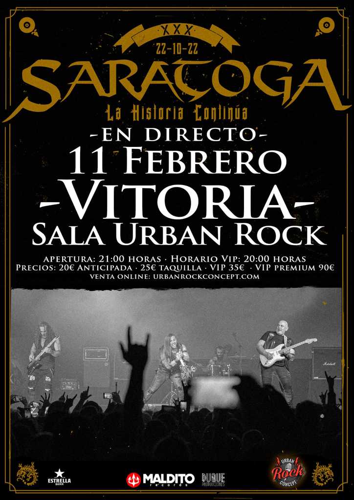 La banda madrileña Saratoga comienzan el año anunciando nuevas fechas por España y Latino América. La primera de ellas será el once de febrero en la Sala Urban Rock Concept de Vitoria. La apertura de puertas será a las 21:00h y el horario V.I.P una hora antes. Las entradas cuestan 20€ en anticipada y 25€ en taquilla, el pase VIP 35€ y el VIP premium 90€. Entradas disponibles en el enlace woutick. Aquí os dejamos todas las fechas: