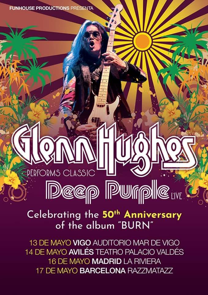 El mítico Glenn Hughes visitará España en el mes de mayo para celebrar el 50 aniversario del clásico disco de Deep Purple "Burn". Serán cuatro fechas en nuestro país, incluida una en Asturias, en el Teatro Palacio Valdés de Avilés donde tan buen sabor de boca dejó tras su última visita en 2019.