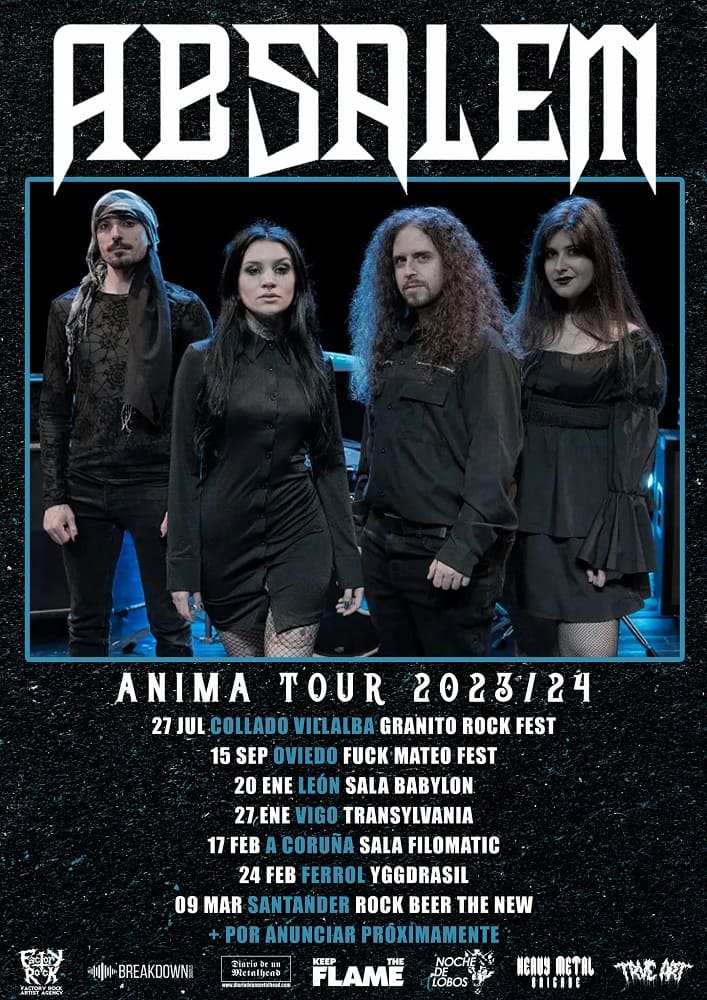 Los astur-salmantinos Absalem arrancan 2024 continuando con las presentación de su último EP "Ánima". León, Salamanca y Vigo son las ciudades que recibirán este mes de enero a la banda y disfrutarán de su EP conceptual de cuatro temas grabado en Breakdown Studios.