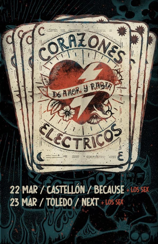 Corazones Eléctricos continúan presentando su estupendo tercer disco "De Amor y Rabia" y los de Pau Monteagudo llegarán este fin de semana a Castellón y Toledo, en dos fechas en las que compartirán escenario con otro huracán llamado Los Sex.