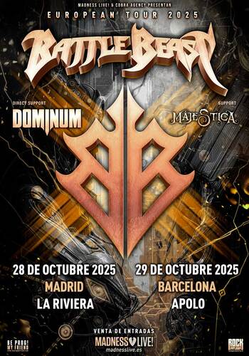 Los finlandeses Battle Beast llegan a España presentándonos su séptimo álbum "Steelbound" que saldrá el próximo 17 de octubre, previo a las fechas en nuestro país. Podremos disfrutar de ello el próximo martes 28 de octubre en la sala La Riviera de Madrid; además, estarán acompañados de los alemanes Dominum y los suecos Majestica.